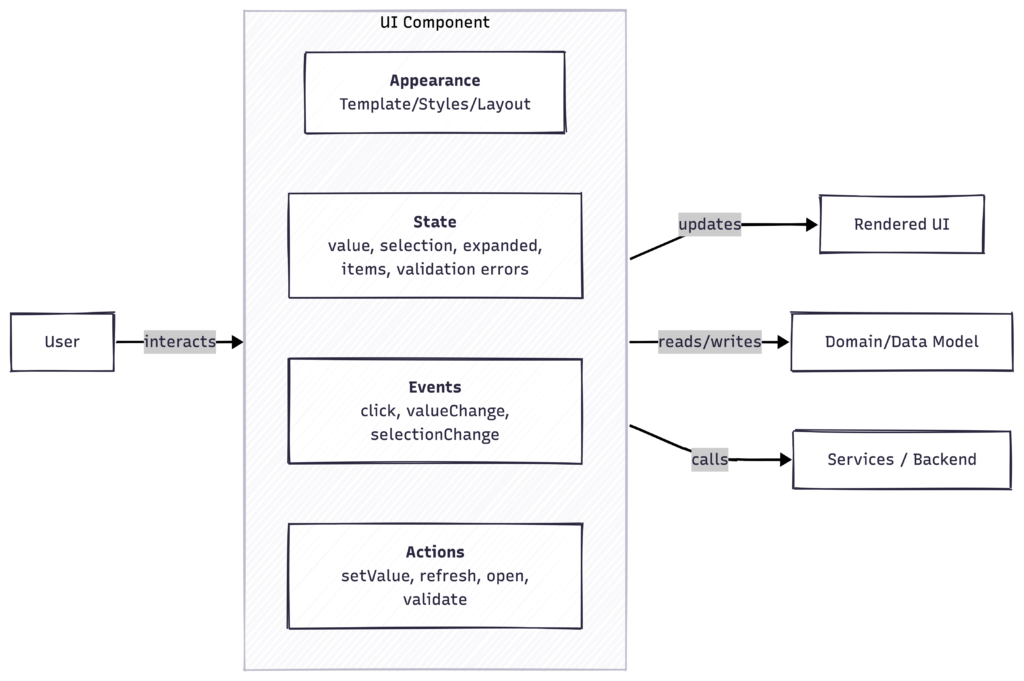 A UI component is often misunderstood as just a visual element. In reality, it is a structured unit of behavior that encapsulates several aspects: